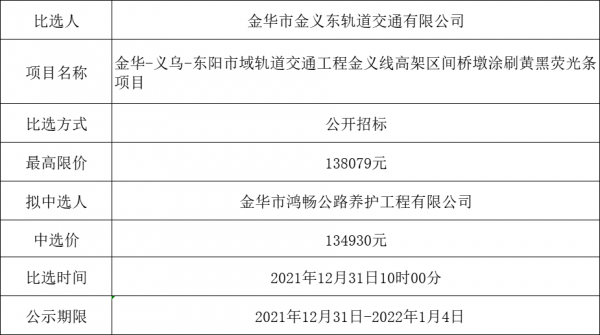 金華-義烏-東陽市域軌道交通工程金義線高架區間橋墩涂刷黃黑熒光條項目中標公示